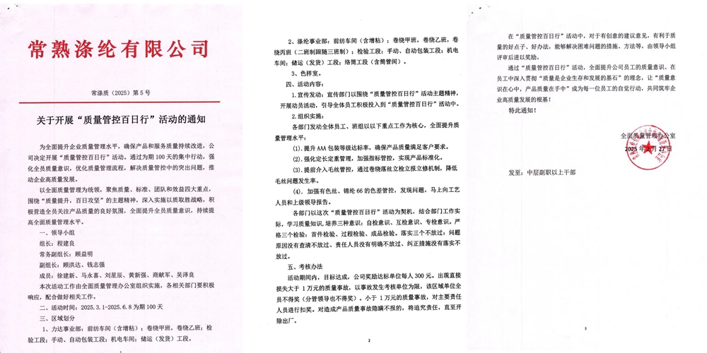 Changshu Polyester는 2025 년 3 월 1 일에 "품질 관리 백일 캠페인"이 시작된 이래 "품질 개선, 백일 캠페인"이라는 주제로 포괄적 인 품질 관리 목표를 고정 시켰으며 여러 차원과 측정을 통해 품질 "안전 밸브"를 강화했습니다. 데이터에 따르면 이벤트 기간 동안 두 비즈니스 부서의 불만 수가 작년에 비해 크게 감소했으며 품질 인식 및 프로세스 최적화가 크게 향상되었습니다.